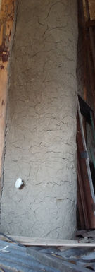 Le conduit, (simple peau), constitué d'un tube d'inox de 20cm de diamètre et recouvert d'un torchis de 8cm tient grâce à une structure grillagée rigide. Les normes actuelles imposent un tubage double peau : un tube dans un tube. Le vide offrant une sécurité pour les feux de cheminée et créant aussi une perte importante de calorie. La couche de 8cm de terre apporte une sécurité égale à la double peau, mais donne en plus une masse thermique, qui se retrouvera dans la pièce. On peut mettre la main dessus (car cela ne dépasse pas les 45°).